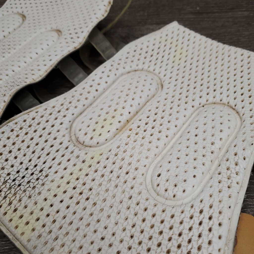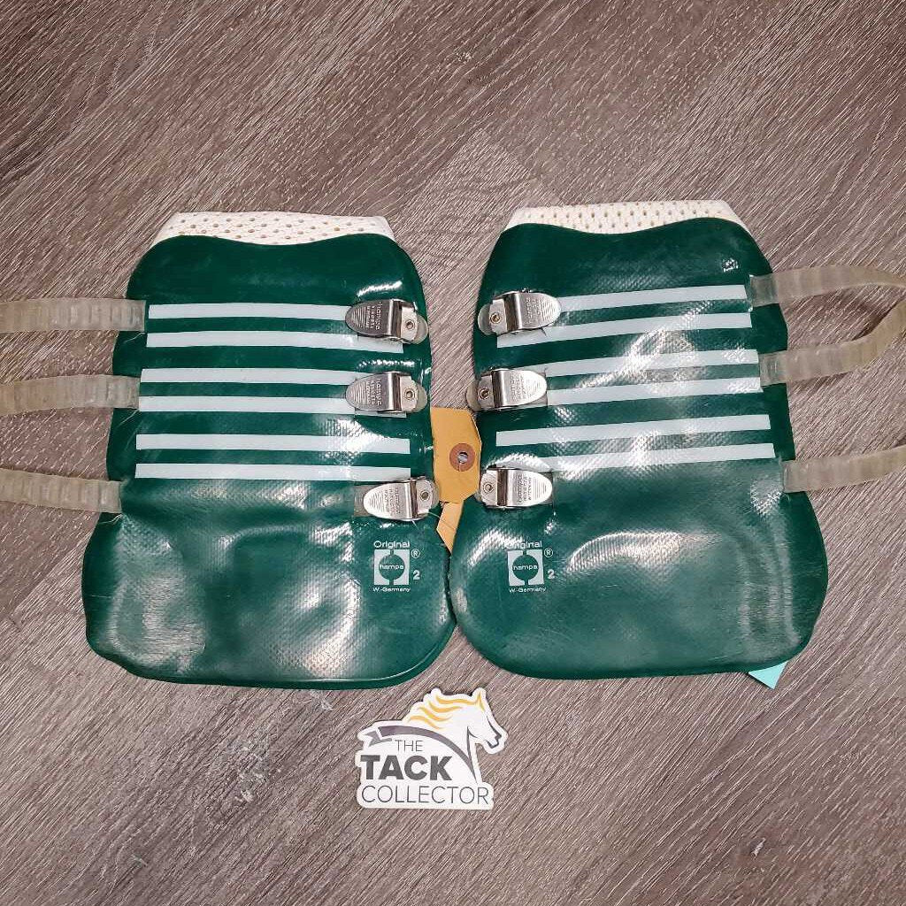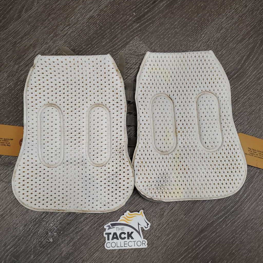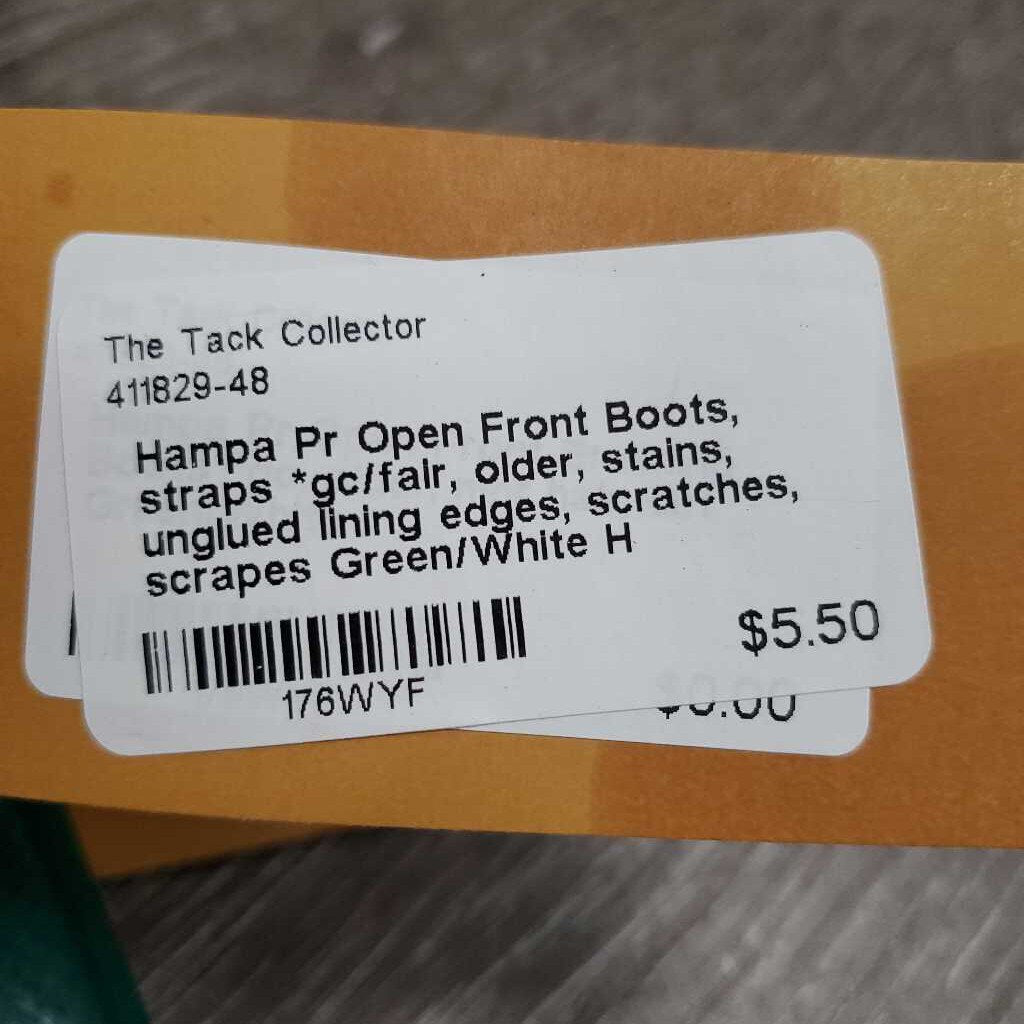 Pr Open Front Boots, straps *gc/fair, older, stains, unglued lining edges, scratches, scrapes