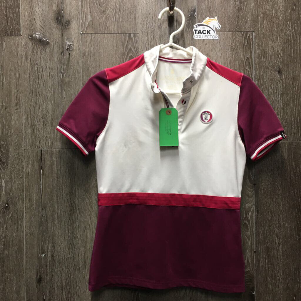SS Polo Show Shirt, 1/3 Button Up, snap collar *gc, mnr stains, dingy?, snags & seam puckers, peeled logos