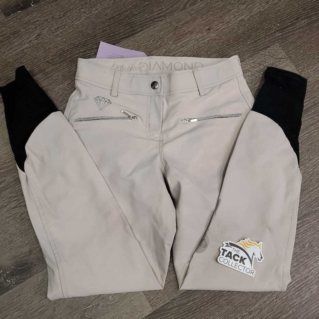 he Elation Diamond Kai Breech is offers comfort in or out of the show ring with a dust resistant, and smooth construction. Offering 4-way stretch for added comfort, and seamless stretch socks for reduced bulk under tall boots. Compete with a belt loops, silicone grip knee patches and 2 front zippered pockets. Silicone knee patch breech 4-way stretch Seamless stretch socks Belt loops 2 zippered front pockets Decorative back pockets