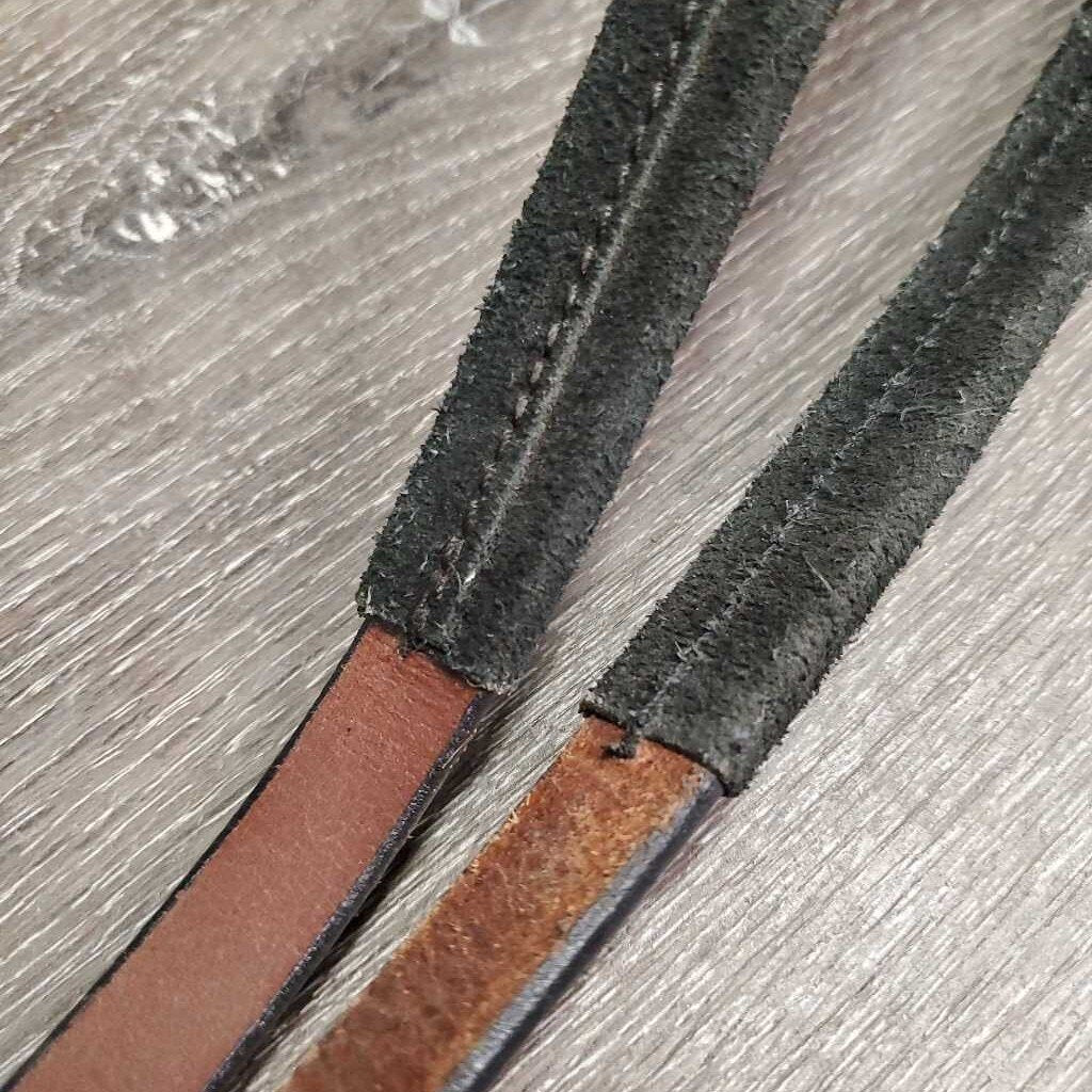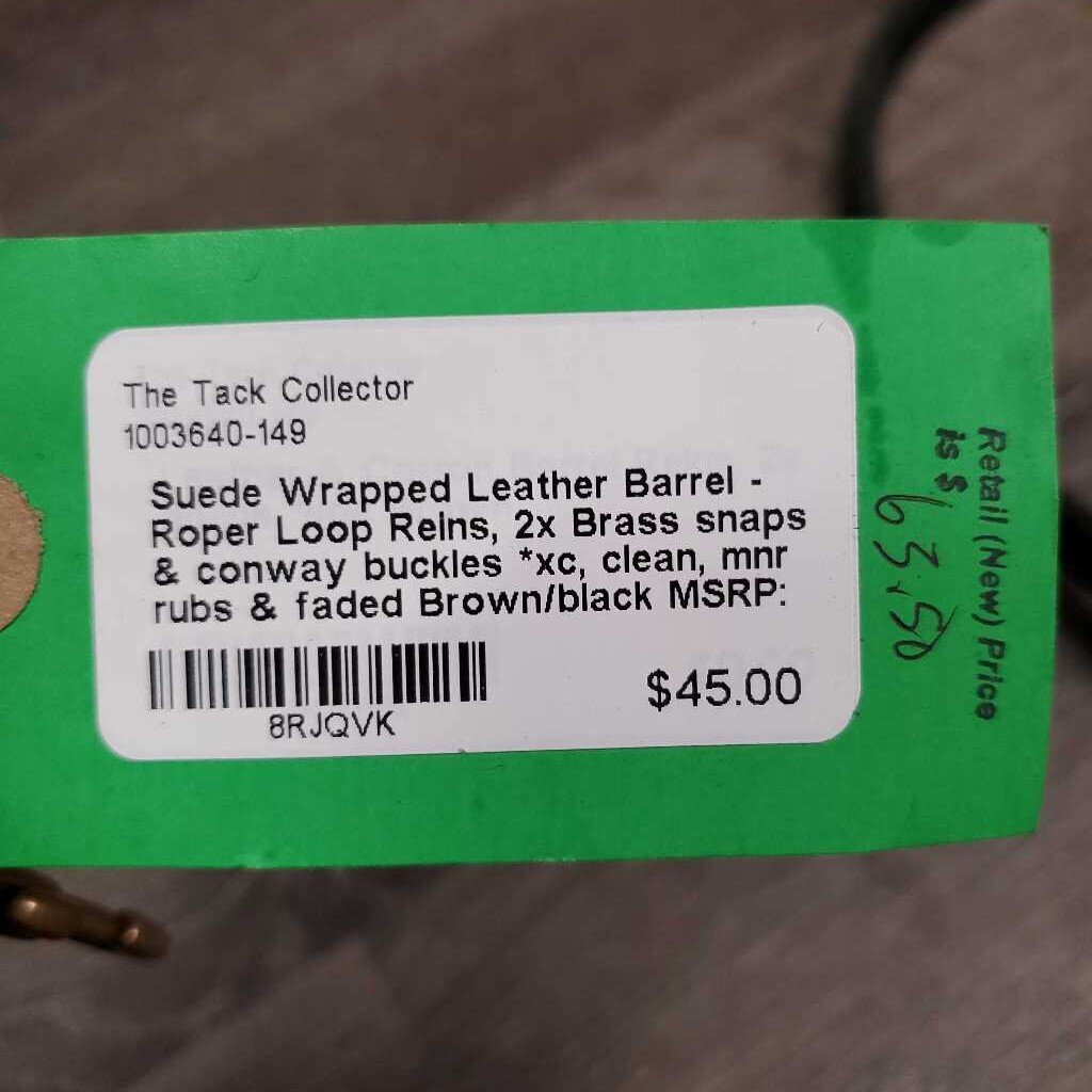 Suede Wrapped Leather Barrel - Roper Loop Reins, 2x Brass snaps & conway buckles *xc, clean, mnr rubs & faded