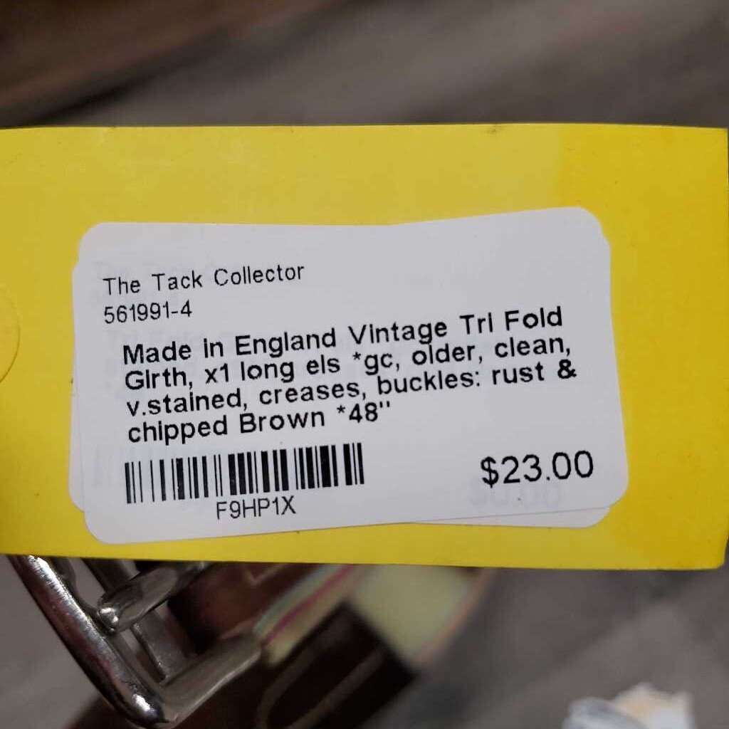 Vintage Tri Fold Girth, x1 long els *gc, older, clean, v.stained, creases, buckles: rust & chipped