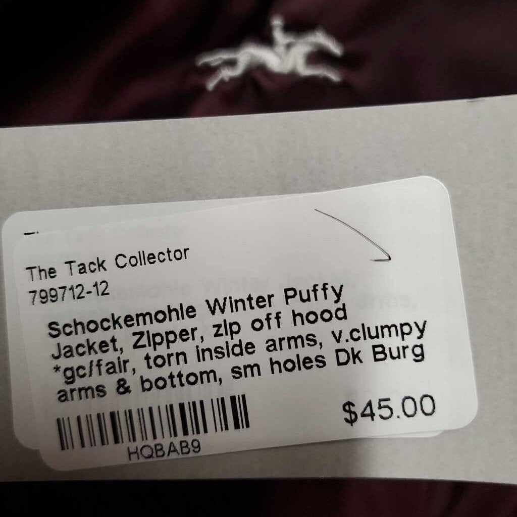 Winter Puffy Jacket, Zipper, zip off hood *gc/fair, torn inside arms, v.clumpy arms & bottom, sm holes