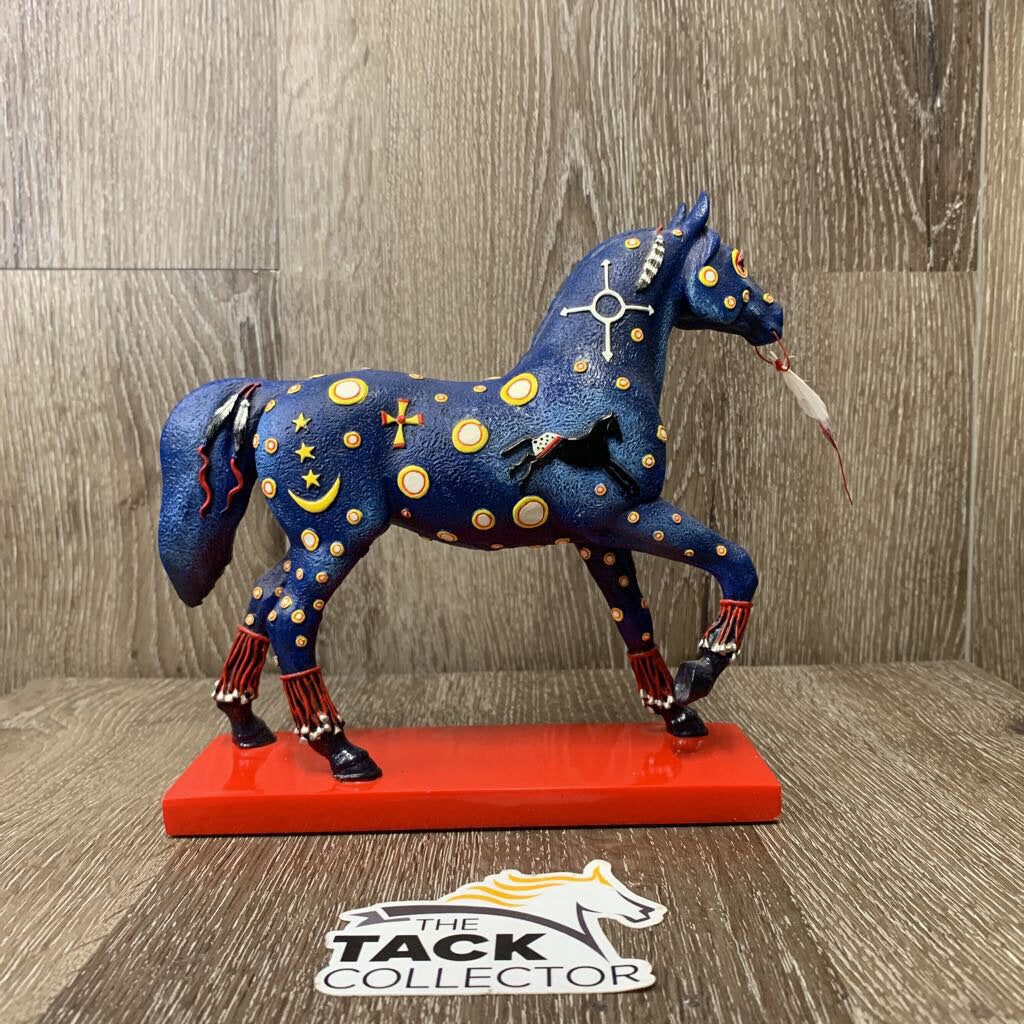 Pony Story: It began with a solar eclipse on January 1, 1889: A Paiute medicine man named Wovoka had a vision that turned into a movement known as the Ghost Dance. Wovoka's dream centered on a ceremony he believed would reunite the living with the loved ones in the ghost world, replenish the buffalo, and ultimately restore the world to its original beauty. In his memory, and as a tribute to this important chapter in American Indian history, Devon Archer, a Virginia artist, has created a Painted Pony inspired by the colors and symbols that can be found on the traditional Ghost Dance shirts and dresses. Release Date: Winter 2009 Artist: Devon Archer Material: Resin Size: 7" Tall Form: Walking Retired: December 2009 Last Number at Retirement: 2E/2581